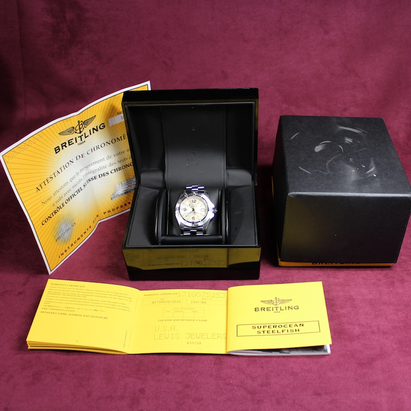 From a price point perspective. It's pretty much a no brainer. Where else can you get a 44mm Automatic Breitling SuperOcean Steelfish for under 2500 bucks. Dependability, legibility and classic good looks are very high on the list of plus points on this watch. Watch comes complete with everything. Inner and outer boxes, warranty cards booklets, travel pod and spare links.