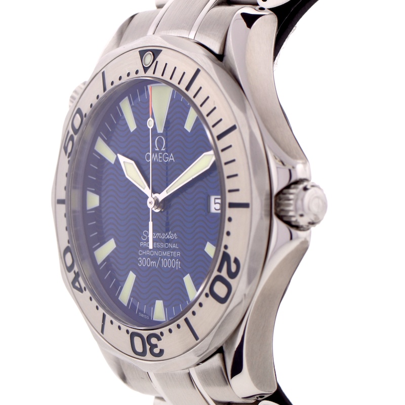 Hard to find now. The Omega Seamaster 300m blue electric version was only released to the japanese market in 1998. The most common versions we see are the dark blue popularised by piece brosnan in goldeneye and the black dial sword hand model. This one features sword hand with lume so strong it will burn your retinas. One feature that distinguishes it between it rivals is that it has a strinless steel bezel insert. Which means that it is far more resistant to knocks and scratches which can eventually be polished out. The screen printed bezels on the black and dark blue versions fade and don't take well to abuse, cannot be polished out and are pricey to replace. All in all a hard to come by piece that will look after you forever.
