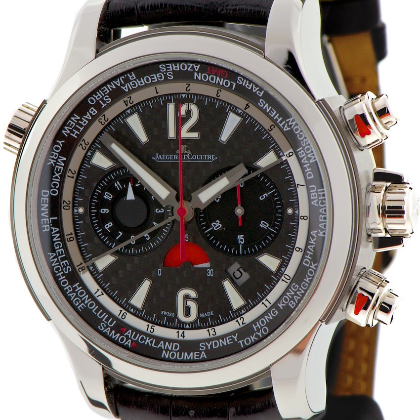 This is the latest Extreme World Chronograph from Jaeger. Its special in many ways but chief among which is that its by far one of the most hard core, complex and super rugged chronographs on the market. This is the carbon dial version that was released at the SIHH watch show in 2010, made of steel/titanium the watch differs slightly from the standard EWC version. It has a inner bezel ring that is smaller to improve overall proportions along with the addition of a carbon dial. The watch is limited to 500pcs and now long sold out. It's filled with technology and finesse. Each watch is tested for 1000 hours and is comprised of a total of 279 parts. It has a very long power reserve of 72 hours and features a patented shock absorber system that protects the brand new automatic chronograph movement from vibrations and shocks in the harshest of climates. It also has a quick strap release button under the case for quick strap changes. Not that you'd want to as it is currently on a custom optional extra black alligator strap with red stitching that matches the red dial accents beautifully. Another feature includes patented half turn collars on the pushers and crown, each collar has black indicating arrows which indicates the crown is non-secure/non-water resistant. When the collar is turned to the secure position it compresses a gasket that ensures water resistance. There are not many other watches out there that are so well built yet so feature packed at the same time, not to mention from one of the best names in the biz.