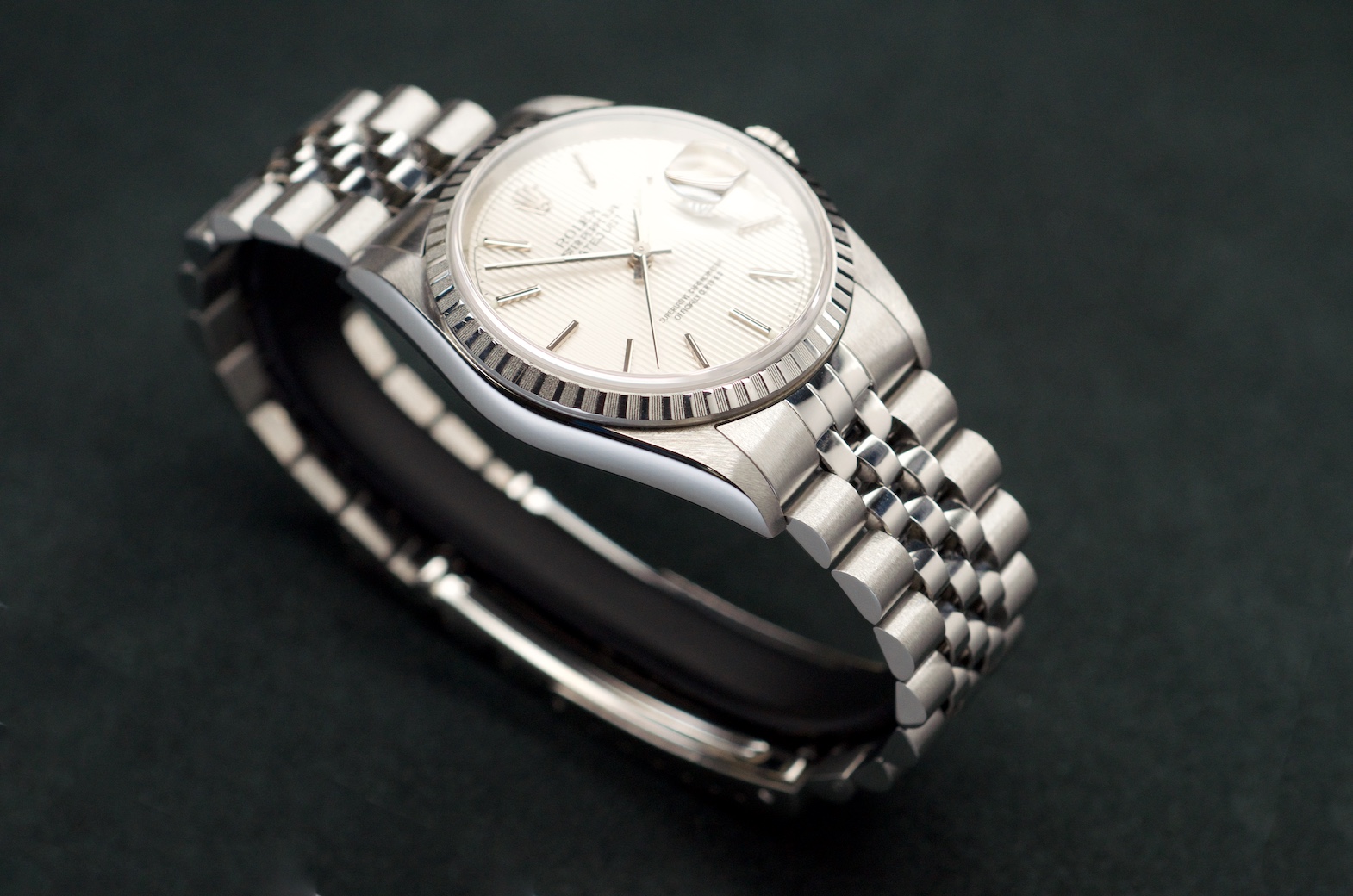 Elegant Tapestry Dial Datejust With Engine Turned Bezel.