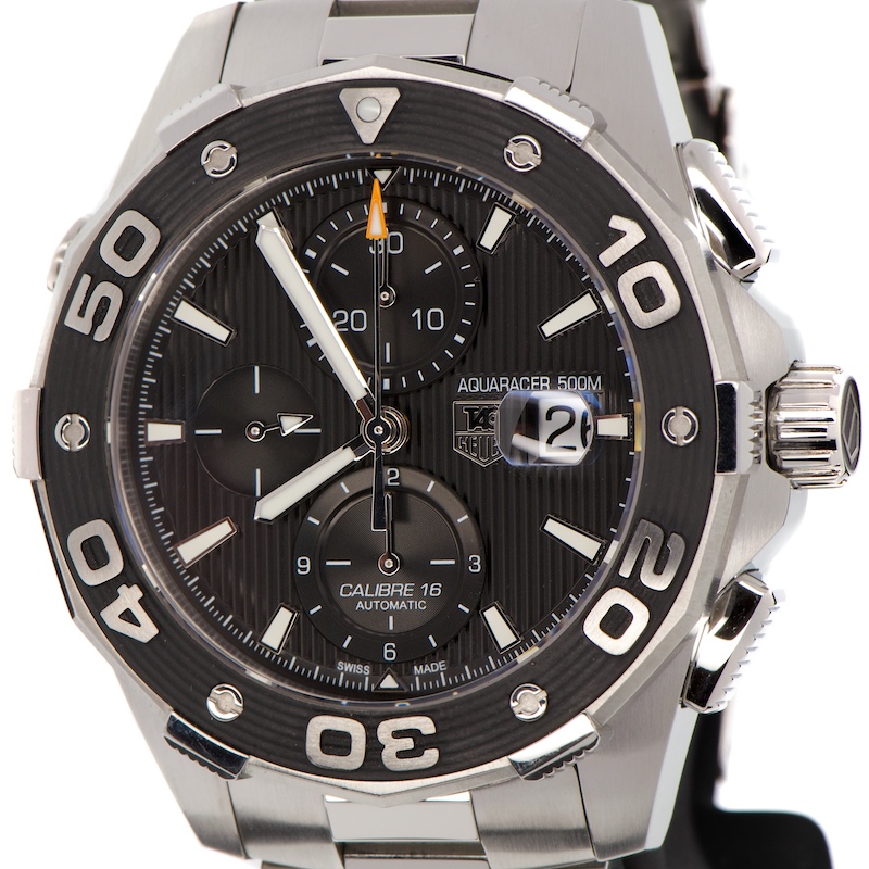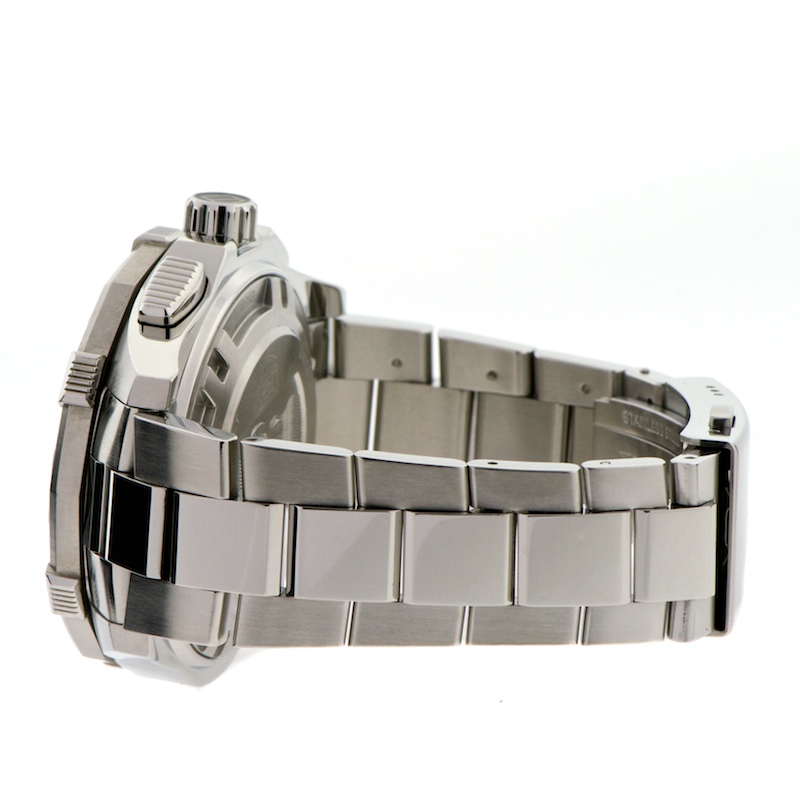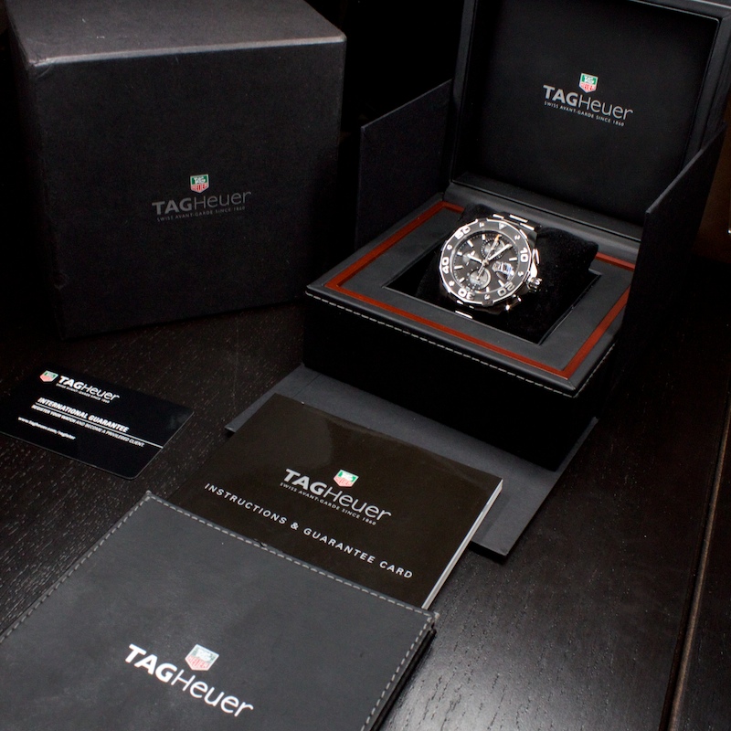 This is by far one of the best build chronographs that money cab buy. This calibre 16 Aqua-Racer has some nice heft and features a lovely dark charcoal pinstripe dial that flickers beautifully when light strikes at particular angles. It is build like a tank and withstand pressures of 500m. It is as new and comes complete with everything, all books, papers, boxes and international warranty cards.