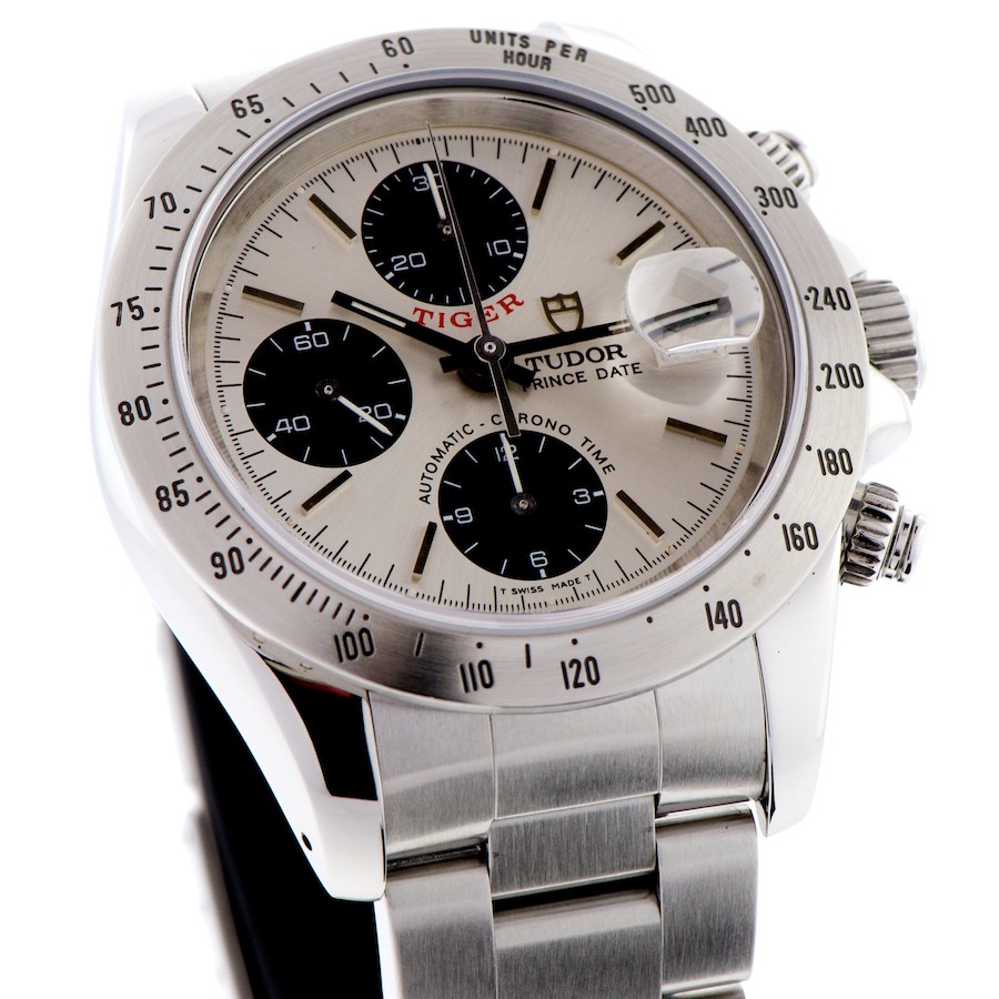The watch on offer here is a Tudor Tiger 79280. Long discontinued and Tiger woods is no longer the ambassador for Tudor. It share allot of design language from is much more expensive brother the rolex daytona. This particular Tudor Tiger features the popular “contrasting” black sub dials, which give it a very masculine sport watch appearance. It features screw town pushers and brushed stainless steel bracelet and houses a valjoux 7750 automatic movement which has been the industry standard movement that has proved itself reliable and accurate for years. This one is in mint condition at a solid 98%. The watch is being offered as is with spare links.